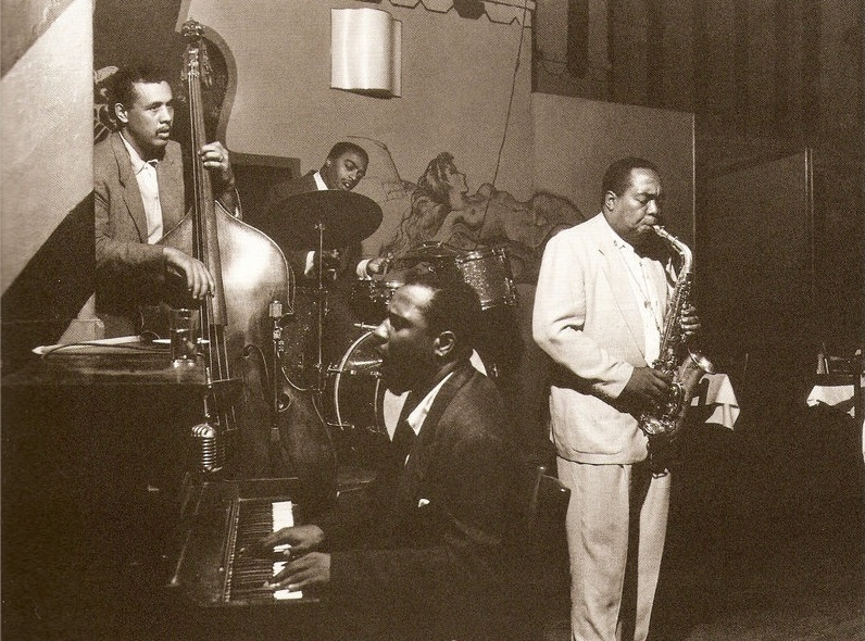 At the Open Door in Greenwich Village. Left to right: Charles Mingus, Roy Haynes, Thelonious Monk and Parker.