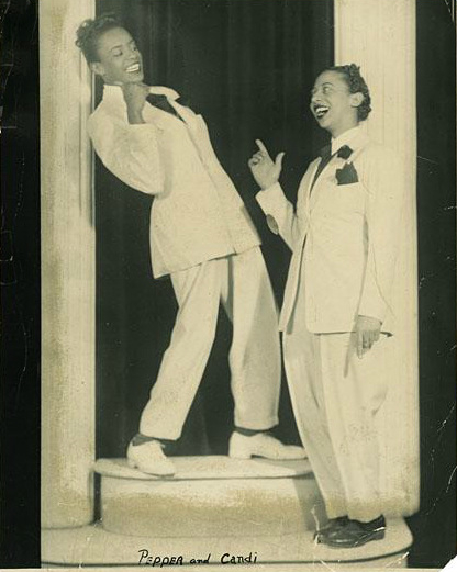 Jewel ‘Pepper’ Welsh and Mildred ‘Candi’ Thorpe danced through the 1930s and made their New York debut at the Apollo in September 1941 on a bill that headlined Stump and Stumpy (male tap dancers). Half of the audience consisted of tap dancers ‘casing’ new acts. “Ladies and Gentlemen, we got two girls who are going to dance for you out of Philadelphia. Candi is sweet, Pepper is hot; come on girls, show me what you got,” the emcee announced. “We tore ’em up!” Thorpe remembered. The act opened with a jazz song, such as ‘On the Sunny Side of the Street,” followed by a rhythm tap solo by Thorpe to ‘I’ve Got Rhythm’ played in stop-time, which allowed her to perform her rhythmic breaks without musical accompaniment. Welch followed with her expressive style of flash dancing. Tall and with a beautiful movement style, she added quick turns to her dancing, her jacket flowing from her body. They closed their act to ‘One O’clock Jump,’ performing trench steps, toe-touching, straddle-split jumps and Russian kazotsky kicks. ‘Candi’ and ‘Pepper’ were called back for so many encores by the Apollo audience that they were moved to the closing act, thus gaining the theater’s highest billing. The act split up three years later in 1944.