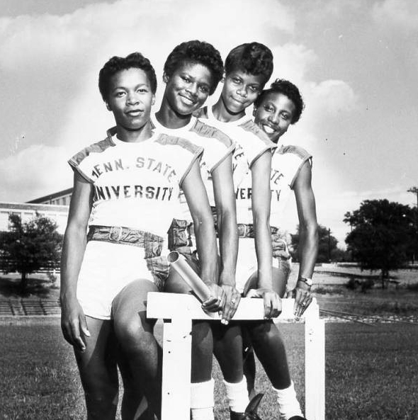 Members of the Tigerbelle Relayers of the Tennessee A & I State College pose beside a hurdle. Pictured are Mae Faggs, Isabelle Daniels, Wilma Rudolph and Lucinda Williams.
