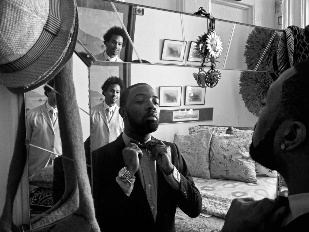James Reynolds watches son Jerome Williams at his first attempt of tying a bow tie. Harlem, NY.