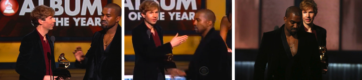 beckkanyeThough he did allow Beck to deliver his speech, West made his protest known simply by standing on the stage only moments after Prince, who was presenting the award, said: “Like books and black lives, albums still matter – tonight and always.”