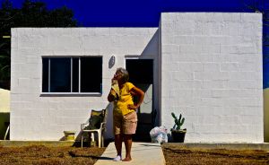 Lady standing outside her newly-built home. Her old one was demolished to make way for the Olympics.
