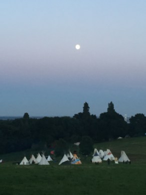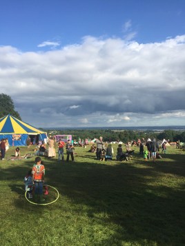 When we arrive people help each other unload camping equipment, food, children and buggies. We descend from our urban space and plant ourselves. The view is breathtaking – clouds low and wide, the curving hills green and soft, tents in yellow and blue shine under sunlight. People, majority white, mill around, chatting, hanging. Though we get a few subtle looks, they are not unkind.