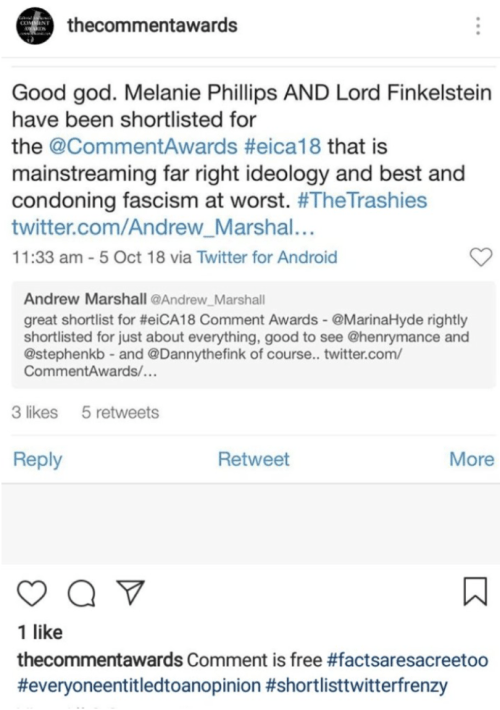 When I and Samantha Asumadu, a former Comment Awards judge in 2016, raised the issue on social media, we too were met with scorn. The Comment Awards re-posted Asumadu’s tweet expressing concern that the shortlisting of Phillips and Finkelstein “is mainstreaming far-right ideology”, adding the following light-hearted hashtags: #factssacreetoo [sic] #everyoneentitledtoanopinion #shortlisttwitterfrenzy.