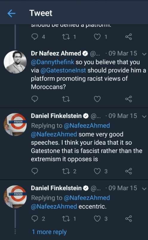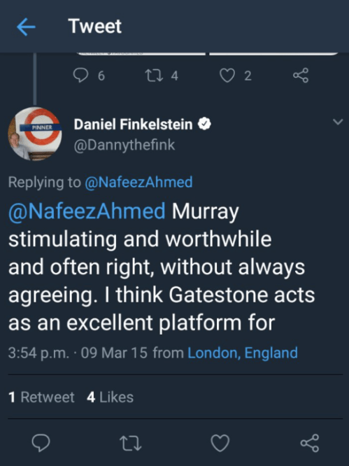 “I naturally don’t (and didn’t) say that I didn’t know who it was or what it publishes or who it hosts. Of course I do. Being on the Board doesn’t mean I agree with every article or speaker, nor does it imply that I don’t. I don’t accept your characterisation of Gatestone… I think Gatestone acts as an excellent platform for some very good speeches. I think your idea that it [is] Gatestone that is fascist rather than the extremism it opposes is eccentric.”
