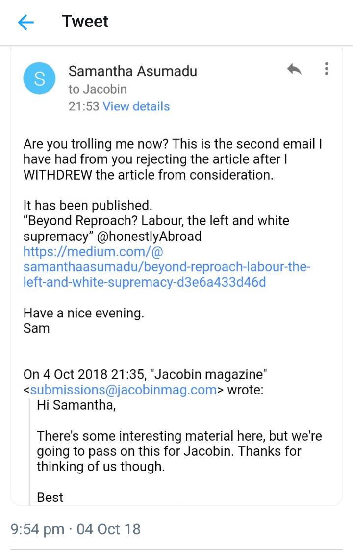 My reply started: Thanks …. That’s a shame. And no it’s unlikely I will place it anywhere else as both independent and mainstream publications with white gatekeepers are rarely interested in the writing of black women. Sometimes we get lucky and find one good person. I had to publish my last article on medium. Beyond Reproach? Labour, the left and white supremacy