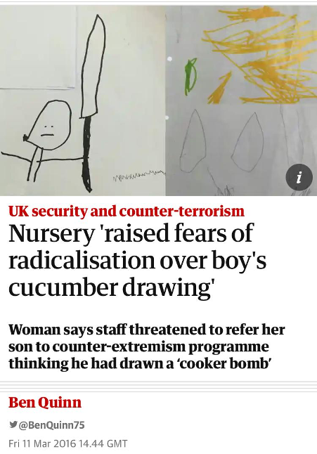 As Asim Qureshi in his piece on the Trojan Horse Affair podcast argues, the UK government supercharged its Prevent strategy and introduced a raft of new laws and regulations in The Counter Terrorism and Security Act of 2015. He says Doctors, Nurses and Teachers are now compelled by legislation to report Muslim children if they show signs of radicalisation with hilarious and tragic consequences. Such as: