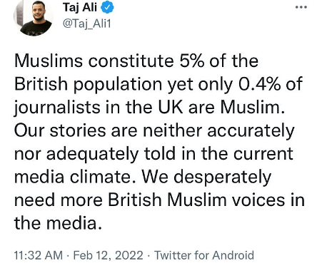 Muslims make up 5% of the UK population but 0.4% of journalists in the UK are Muslim. Out of the 0.4% of Muslim journalists how many are from a working class background like the area in Birmingham? And because someone has to say it, how many of the most prominent Muslim journalists are just Brown faces for Islamophobia and increasing securitisation of Muslims?