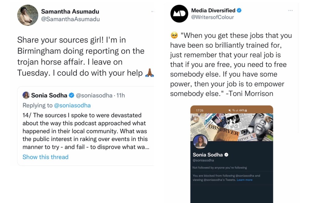 If Sonia Sodha cared to listen to the podcast, she would have heard Amina’s powerful email saying not only had she never been contacted by anyone, including journalists (from Sue Packer’s claim that she was doing it for Amina), but that she resented the fact that she apparently needed a white woman to save her.